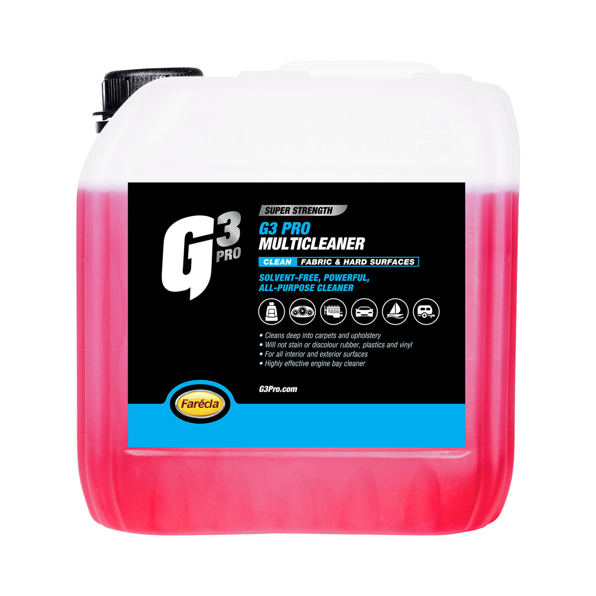 A G3 Pro Multicleaner egy agresszív, mégis biztonságos univerzális tisztítószer (APC), amely minden puha és kemény felületen használható, beleértve a motortereket, a kerékjárati íveket, a szőnyegeket és a kárpitokat. Ez egy szilikonmentes tisztítószer, amely nem színezi el a gumit, a műanyagokat vagy a szövetet. A maximális teljesítmény érdekében tiszta állapotban használja, de vízzel hígítható, könnyebb szennyeződés esetén.