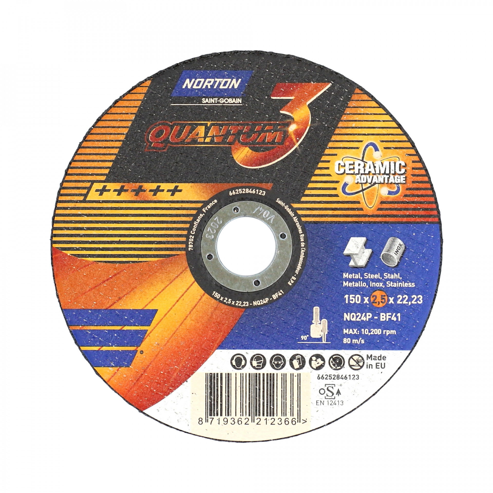 A Norton Quantum fém-inox vágókorong jellemzői a rendkívül gyors vágás, magas élettartam és kitűnő vágóképesség. Innovatív, kerámia vágókorongok. A legújabb fejlesztés, a legnagyobb sebesség és a legnagyobb kopásállóság a leghidegebb vágáshoz. Az innovatív Norton Quantum3 termékcsalád ultravékony kerámia vágókorongjai új szintre emelik a vágási teljesítményt a kényelem, az élettartam és a sebesség terén rendkívüli precizitással, gyorsasággal és pontossággal. A kerámia szemcsék adják ennek a korongnak egyedi karakterét, kategóriájában a legjobb teljesítményt nyújtva acélon és rozsdamentes acélon. Vágjon kevesebb rezgéssel, mivel a szuperéles kerámiaszemcsék alacsony nyomáson is folyamatosan dolgoznak, így a kezelő hosszabb ideig kényelmesebben vághat.